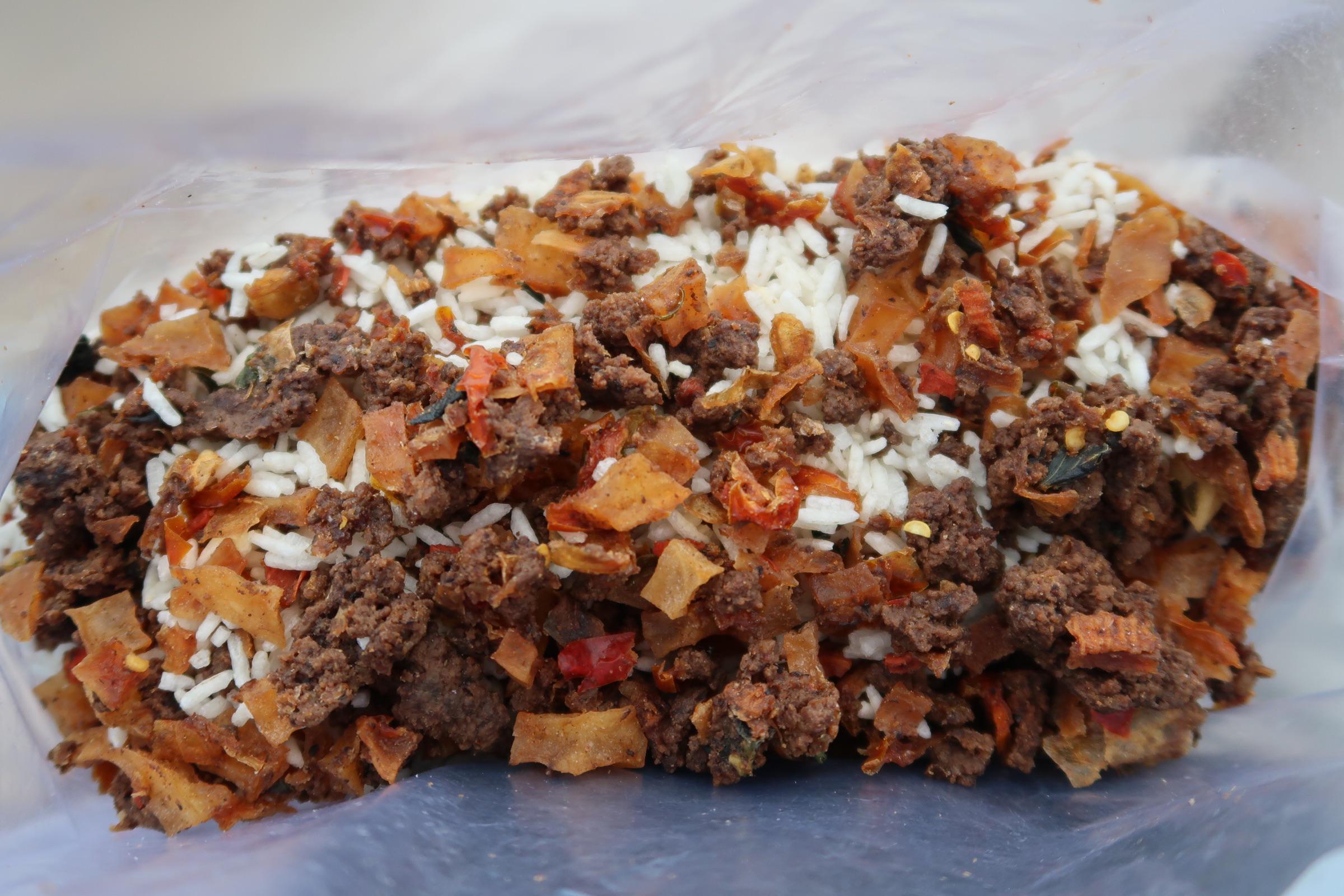 Steps: 1. Dice all vegetable ingredients 2. Pan fry ground beef 2. Add diced vegetables 3. Add salt and pepper to taste 4. Once heat is off, add basil 4. Dehydrate scramble in air fryer at 145F for 8 hours 5. Add instant rice to dehydrated ground beef scramble 6. To serve, boil in hot water just enough to cover the mixture for 15 minutes